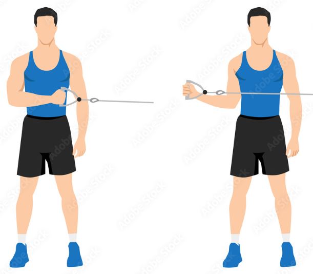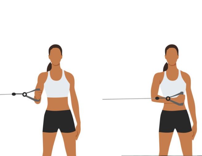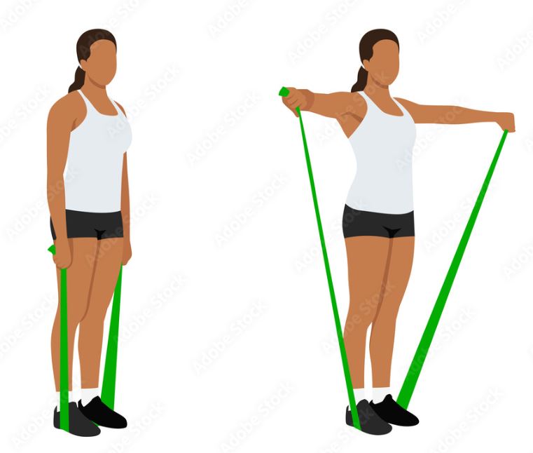 1) Side raises – Stand on the band with both feet and hold the handles of the band with your hands. Start with your arms down at your sides and then slowly raise your arms out to the side, keeping your elbows slightly bent. As you lift your arms, you should feel the tension in the band increasing and your shoulder muscles working. Hold the position briefly and then slowly lower your arms back down to your sides.